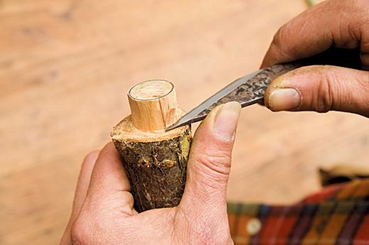 切り出しナイフで滑らかに丸く整える。削りすぎると口金が緩くなってしまうので、時々はめてみながら作業すると失敗しない。