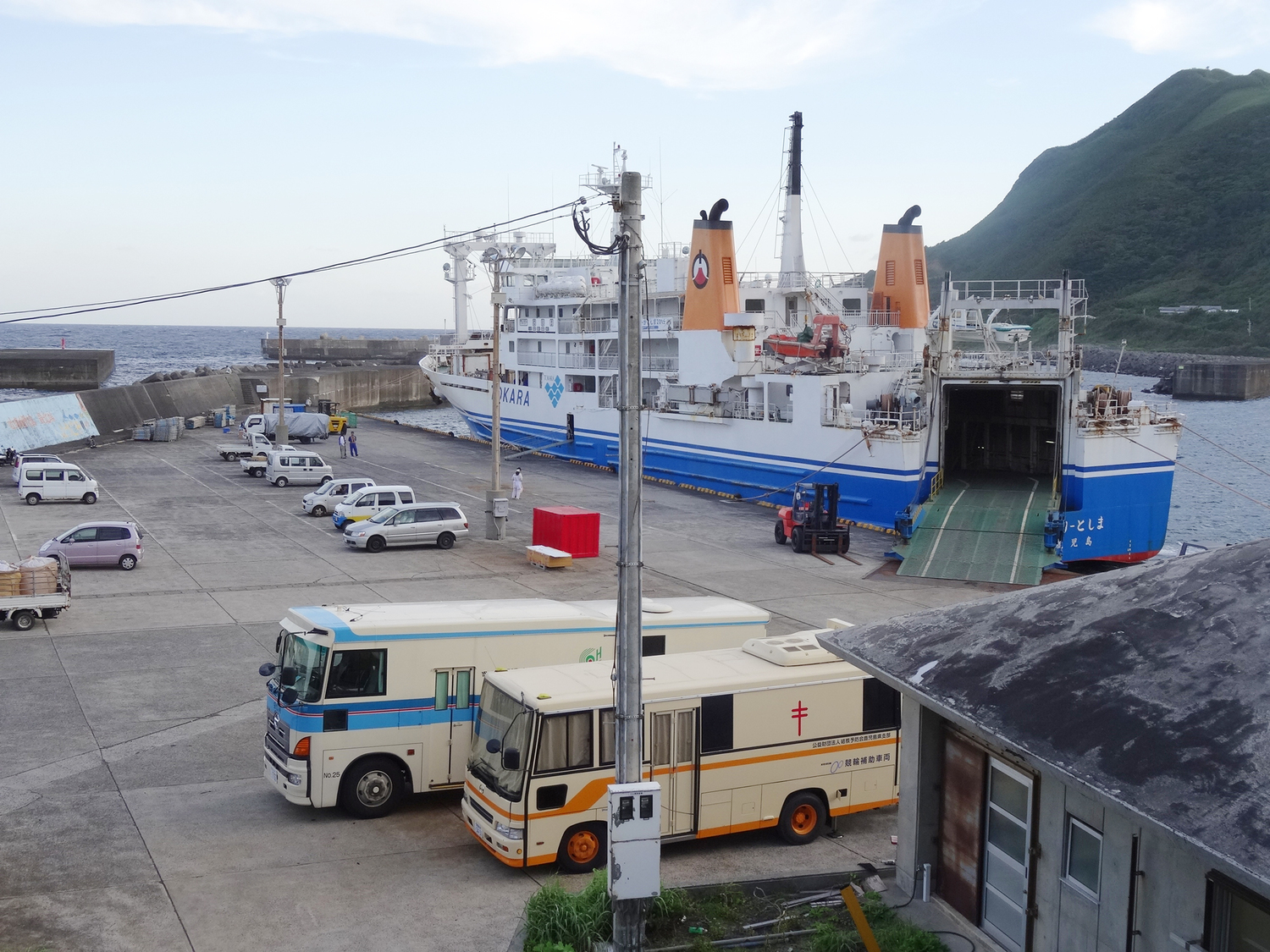 ついでに、もうひとつ全島制覇できる航海日があります。それは毎年5月の某日に運航する通称「レントゲン便」! 要は健診船。トカラ列島は各島に診療所はあるものの、各診療所に看護師が1名常駐しているのみ、医師は不在なのです。医療設備も揃っているわけではありません。また、島民が鹿児島市内に出かけて健診を受けるには、時間と交通費がかかる。と、言うわけで、レントゲン車を2台「フェリーとしま2」に乗せ、鹿児島市内の医師や保健師も乗せ、各島の港で野外健診を行うのです。この日も「フェりーとしま2」は変則運航になります。