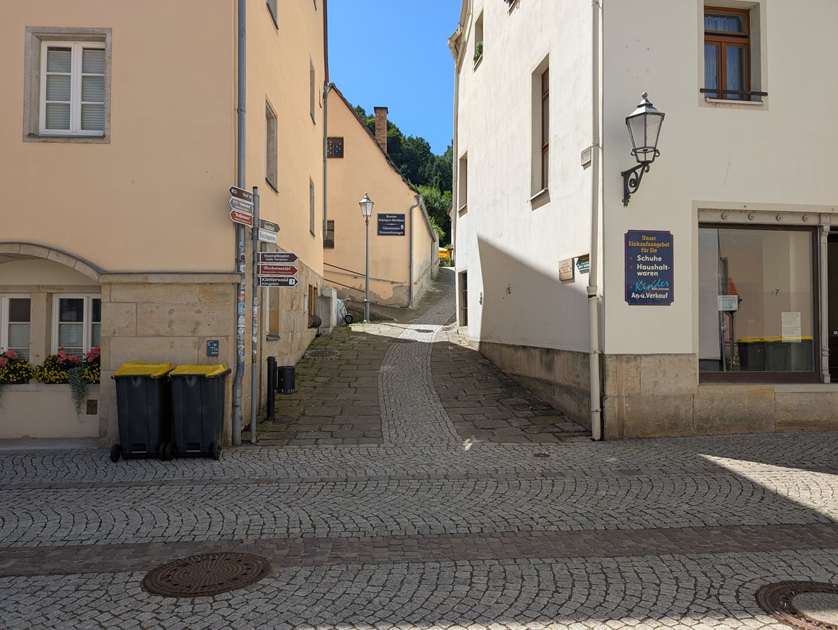 出発から5分後、右に折れて石畳の坂を登り始めます。