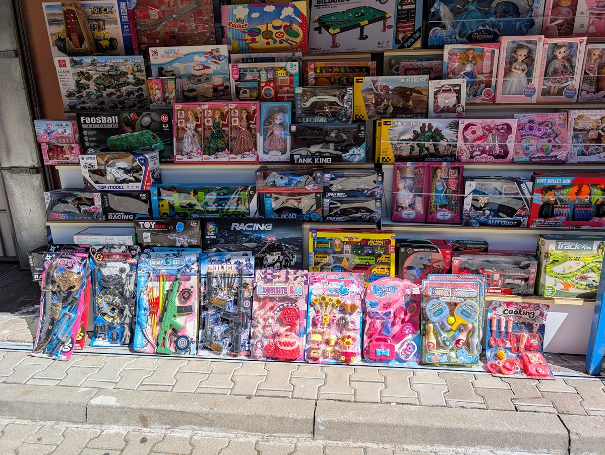 服や帽子を売っている店が多いですが、昔懐かし系のおもちゃを売る店も。