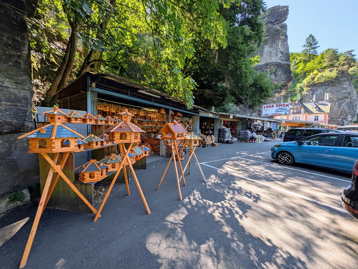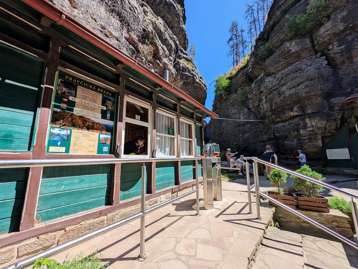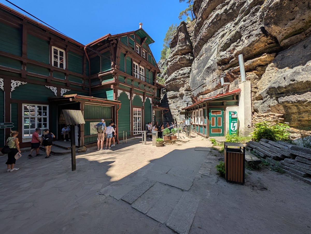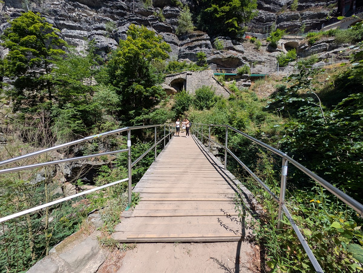 ドレスデンから近郊列車1本で50分。Schmilka-Hirschmühle駅で下車して、すぐのところにある橋を渡りながら国境を越え、徒歩7分。チェコ側のバス停からバスに乗り、12分のところにある「プレビッシュトアー」最寄りのバス停で下車。あとは歩いて37分です。