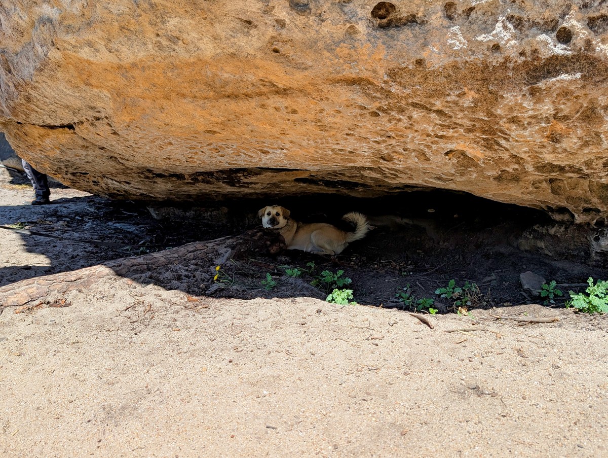 あまりの暑さに岩の下に入り込んでてこでも動こうとしないワンちゃん。