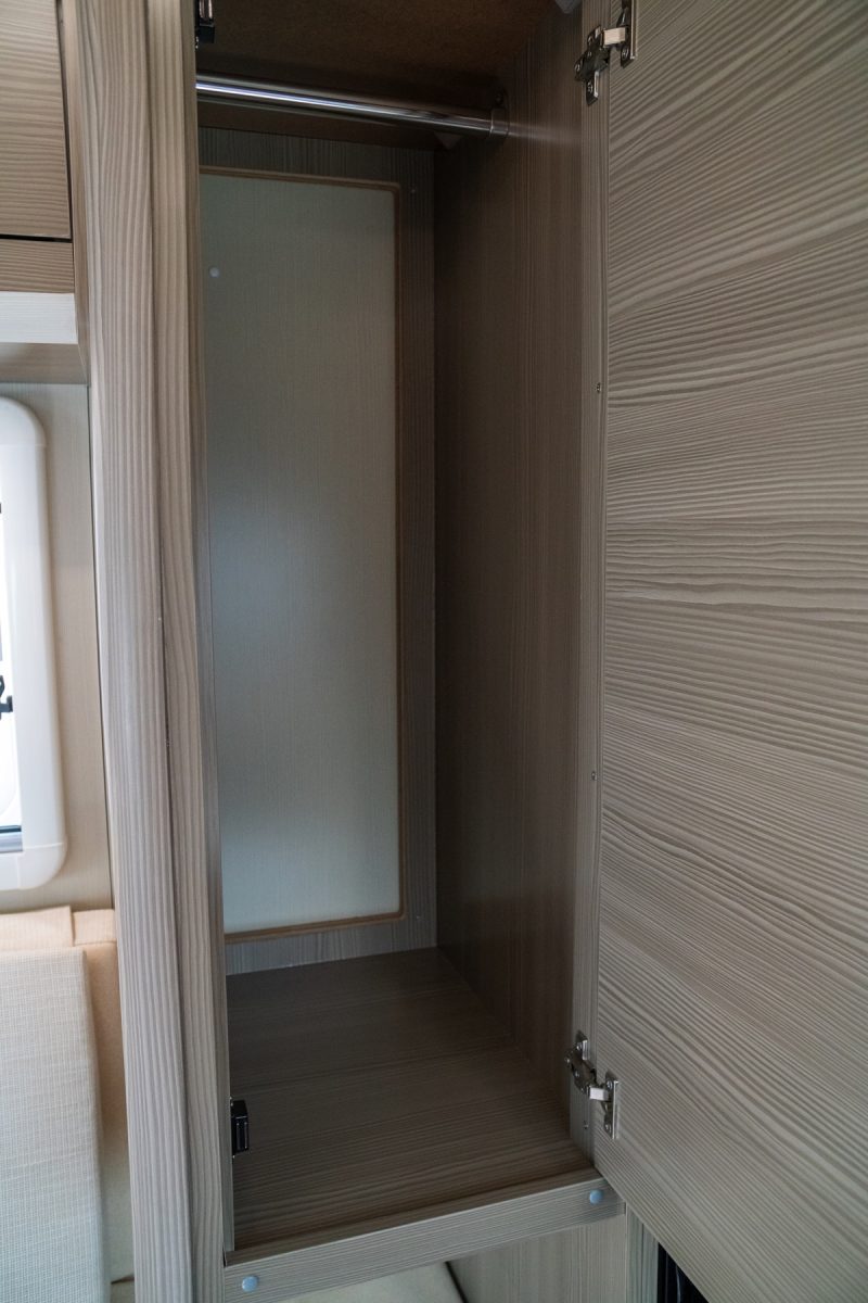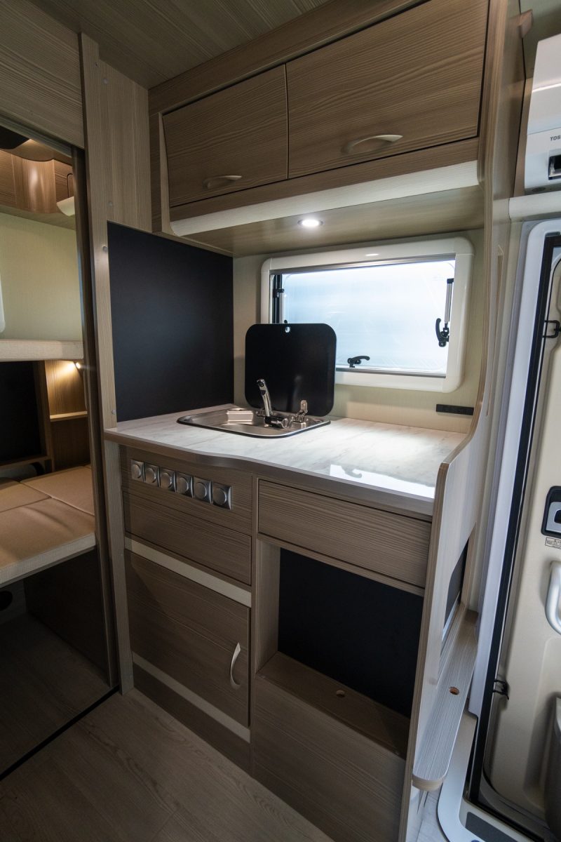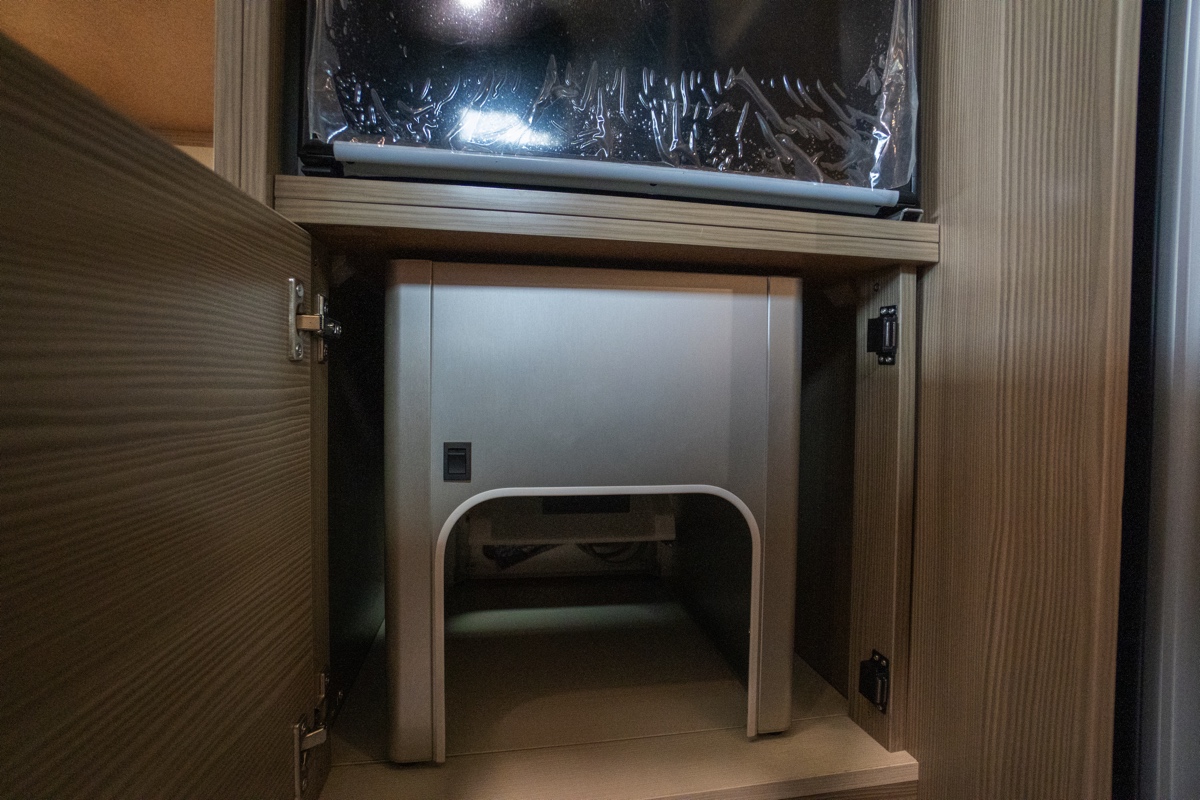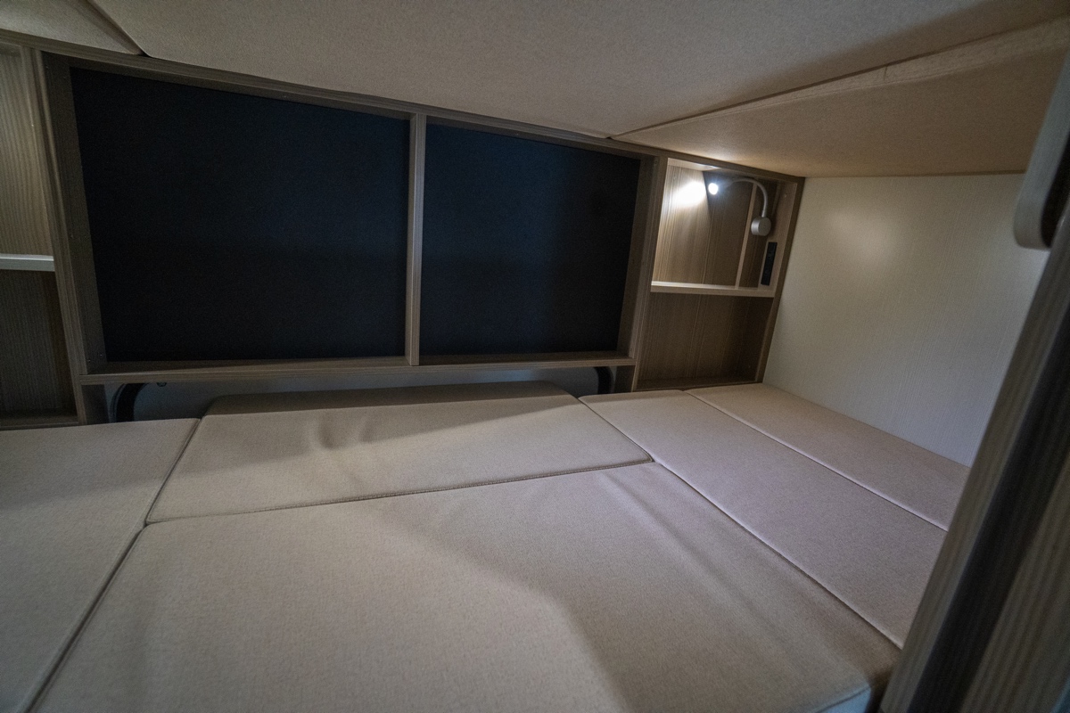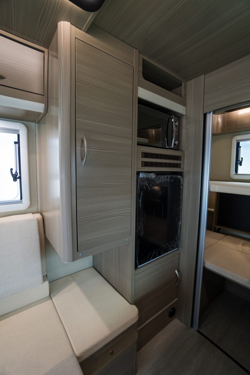 エントランス右手は通路を挟んでキッチンやワードローブを配置。最後部はマルチスペースになっており、標準装備の下段ベッドはマットを組み替えて対面単座モードにできるほか、引き戸が備わっているためトイレルームとしても活用が可能。外部扉も備わっているので荷物置き場としても活用できるなど、それぞれの使い方に合わせ変化させられるよう、工夫が凝らされています。