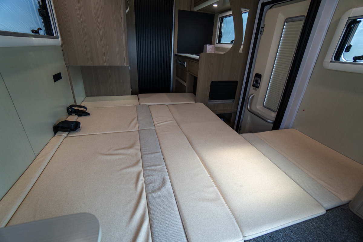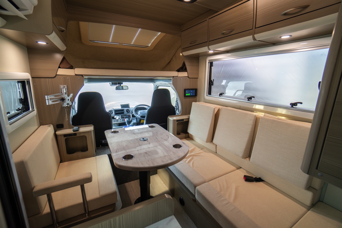 インテリアは一般的なキャブコンとは異なり、セカンドシートに横座りシートを配置。二の字に向き合ったシートは横座座りの3人掛けソファプラス単座シートの組み合わせで、ここがリビングスペース。向き合って4人が着座できるほか、エントランス側と通路にマットをセットすればコの字型でテーブルを囲むことができるようになっているため、大人数にも対応。取材車にはスカイビューウインドウが備わり、採光性もよくコンパクトさを感じさません。