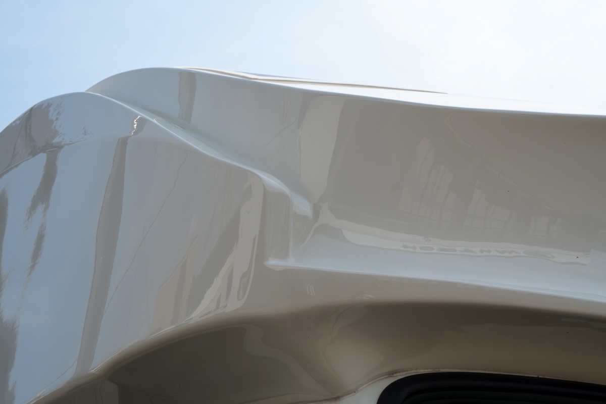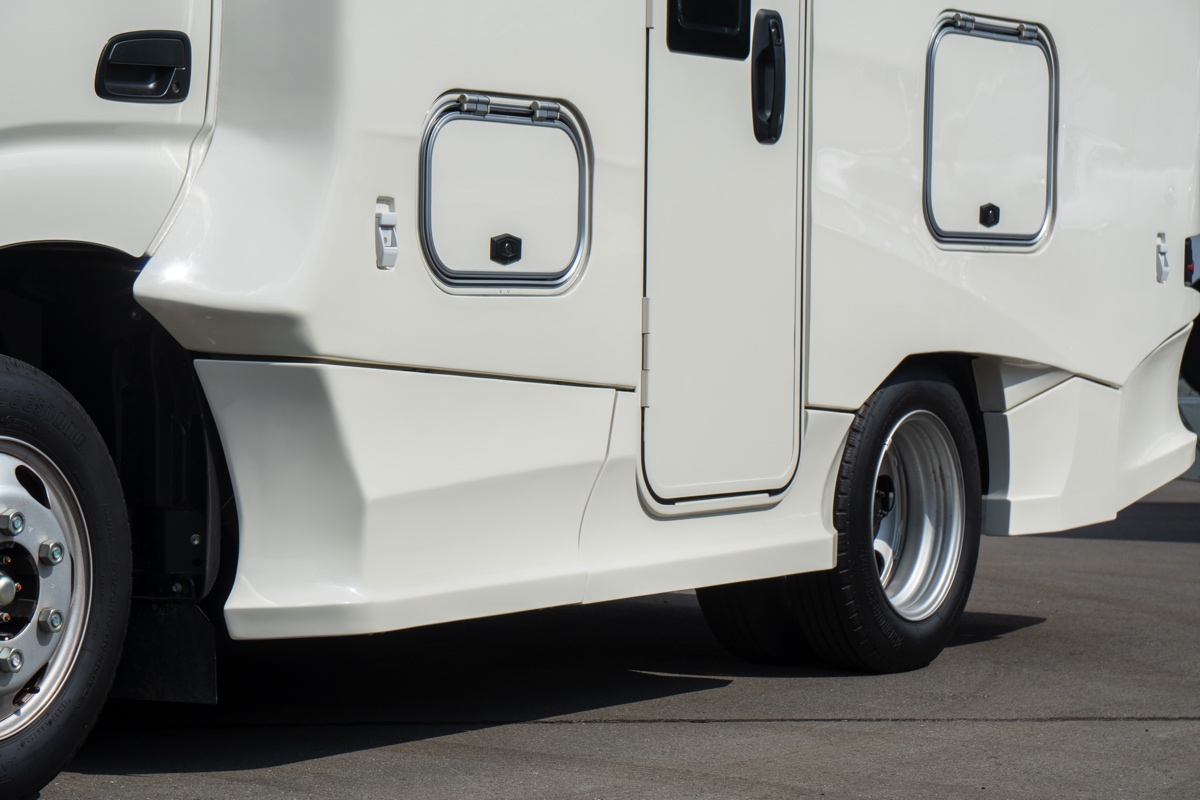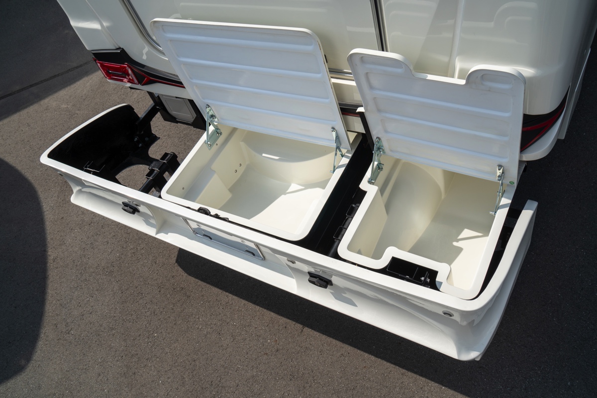 車両を見て最初に驚いたのはボディ形状で、FRP一体成型ボディは彫りの深い立体的な造形美が魅力的。キャブコンのなかにはボテッと見えたりするモデルもあったりしますが、メリハリの利いたデザイン性の高さはトリアスの見どころのひとつといえます。さらにこのフォルムは空力性能や雨水の流れも考慮されて設計されており、見た目と機能を両立。オプションのリアスポイラーを装着すれば、さらに走行性を高められるようになっています。