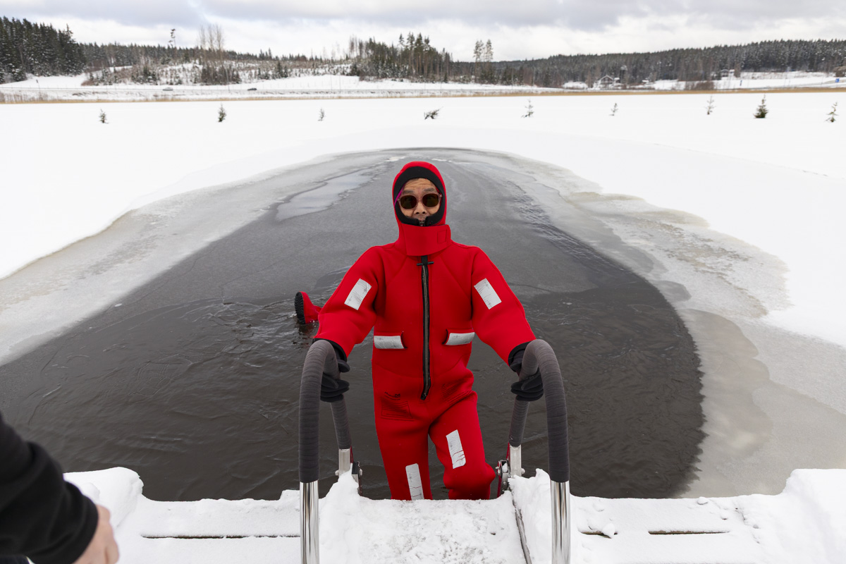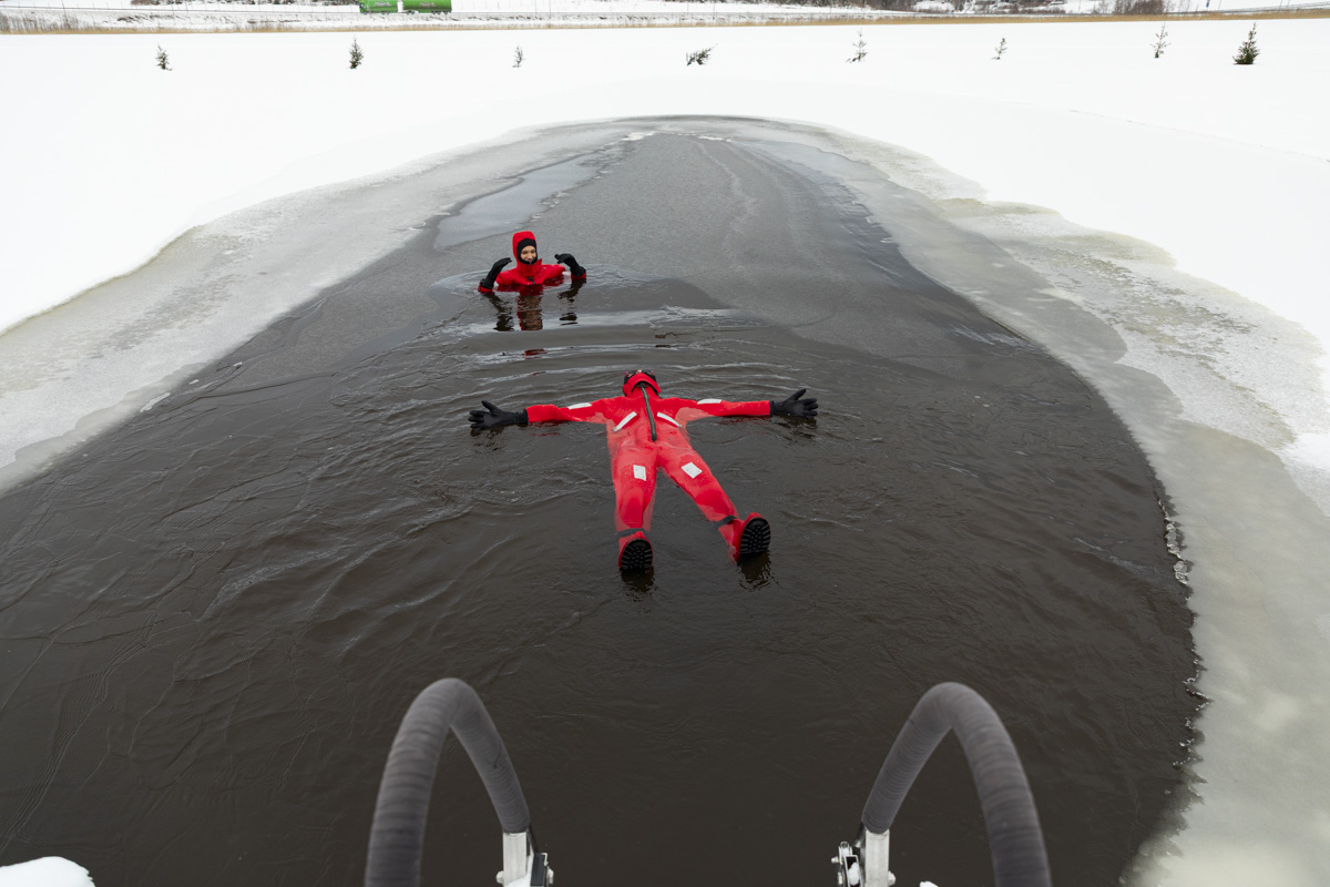 水が浸入しない着ぐるみ系ボディースーツを着込んで、凍った湖の氷がない部分に浮かぶというアクティビティ。そう聞いたときの第一印象は「このアクティビティ、要る?」。「水が浸入しないボディースーツ」と言われても…ダチョウ倶楽部さんがお得意とする「熱湯風呂」の逆バージョンの匂いがプンプンします。