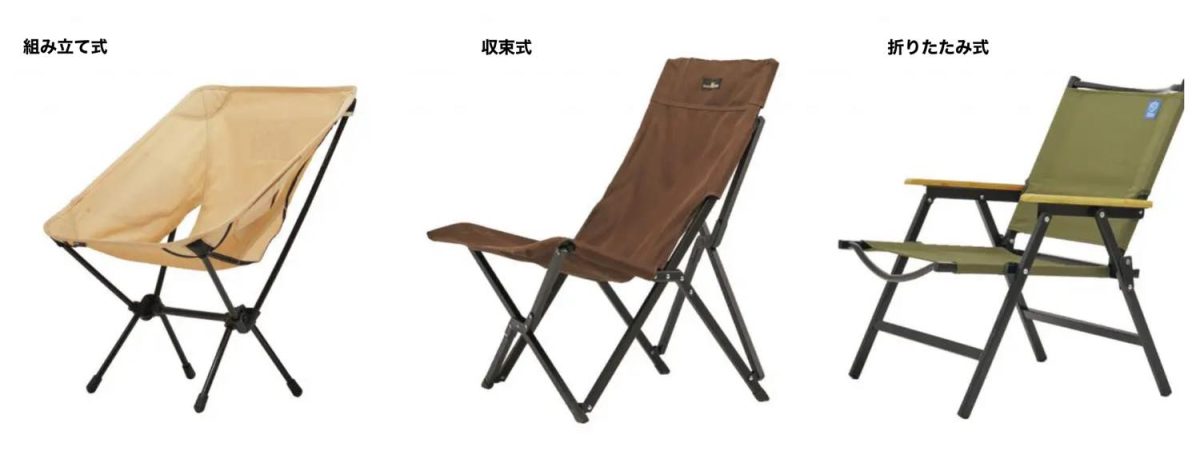 座面や背もたれの生地、フレームがくっついていて、開くだけで準備完了となる「折りたたみチェア」(フォールディングチェアとも言う)、脚と座面を同時に広げる「収束式チェア」、そして生地とフレームがバラバラになっている「組み立て式チェア」です。