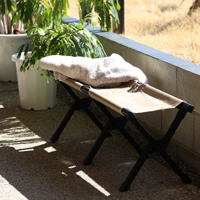 おしゃれでコンパクトな折りたたみベンチ。ナチュラルな色合いとブラックフレームの組み合わせで、どんなキャンプサイトにもマッチするデザイン。耐荷重160kgで、大人2人がゆったり座れるサイズ。シートはフラットなのでクーラースタンドや荷物置きにも最適だ。高さ38.5cmの座面は大人も子どもも快適に使える。収納袋付きで持ち運びも楽々。