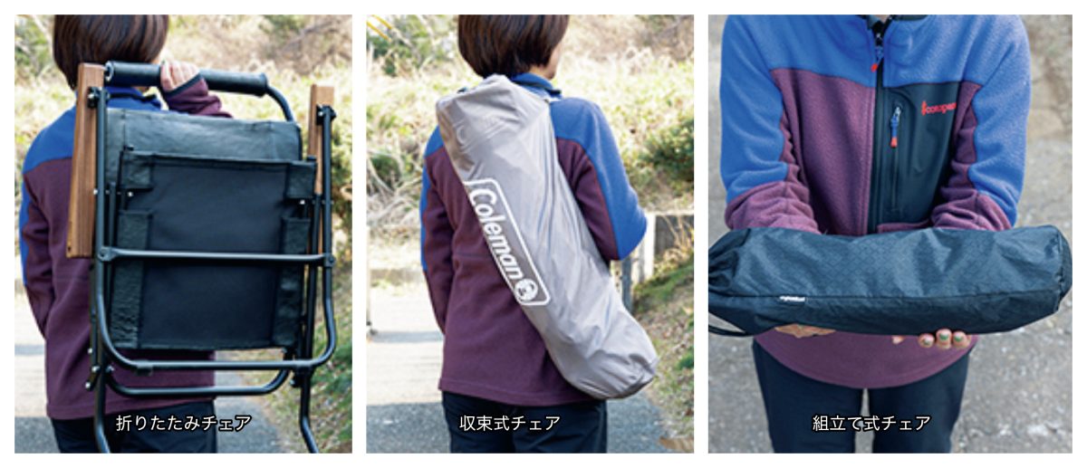 組み立て式チェアは手間がかかりますが、コンパクトに収納できて軽量なものが豊富。収束式チェアは細長くなり、ケースに入れて肩掛けすれば2〜3脚まとめて持ち運べます。折りたたみチェアは幅広ですが薄くなり、重ねて収納できるという特徴があります。