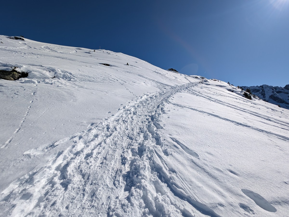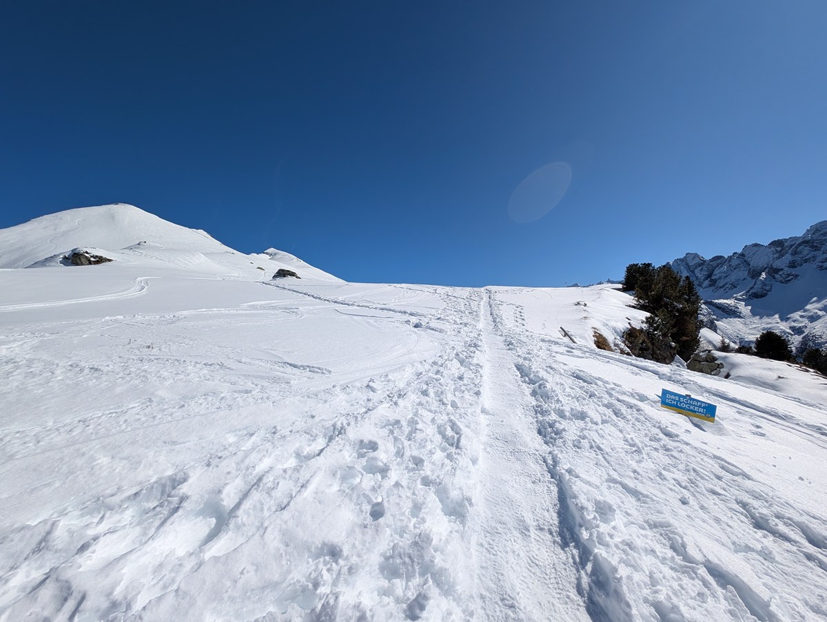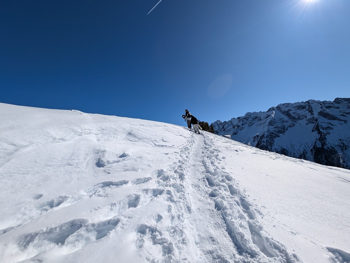 最初は順調。じつはこの朝、バタバタしていてせっかくオーストリアまで持ってきたスノーシューズに履き替える時間がなくハイキングシューズで向かったのですが、少なくとも登りは特に滑る感じではなかったです。