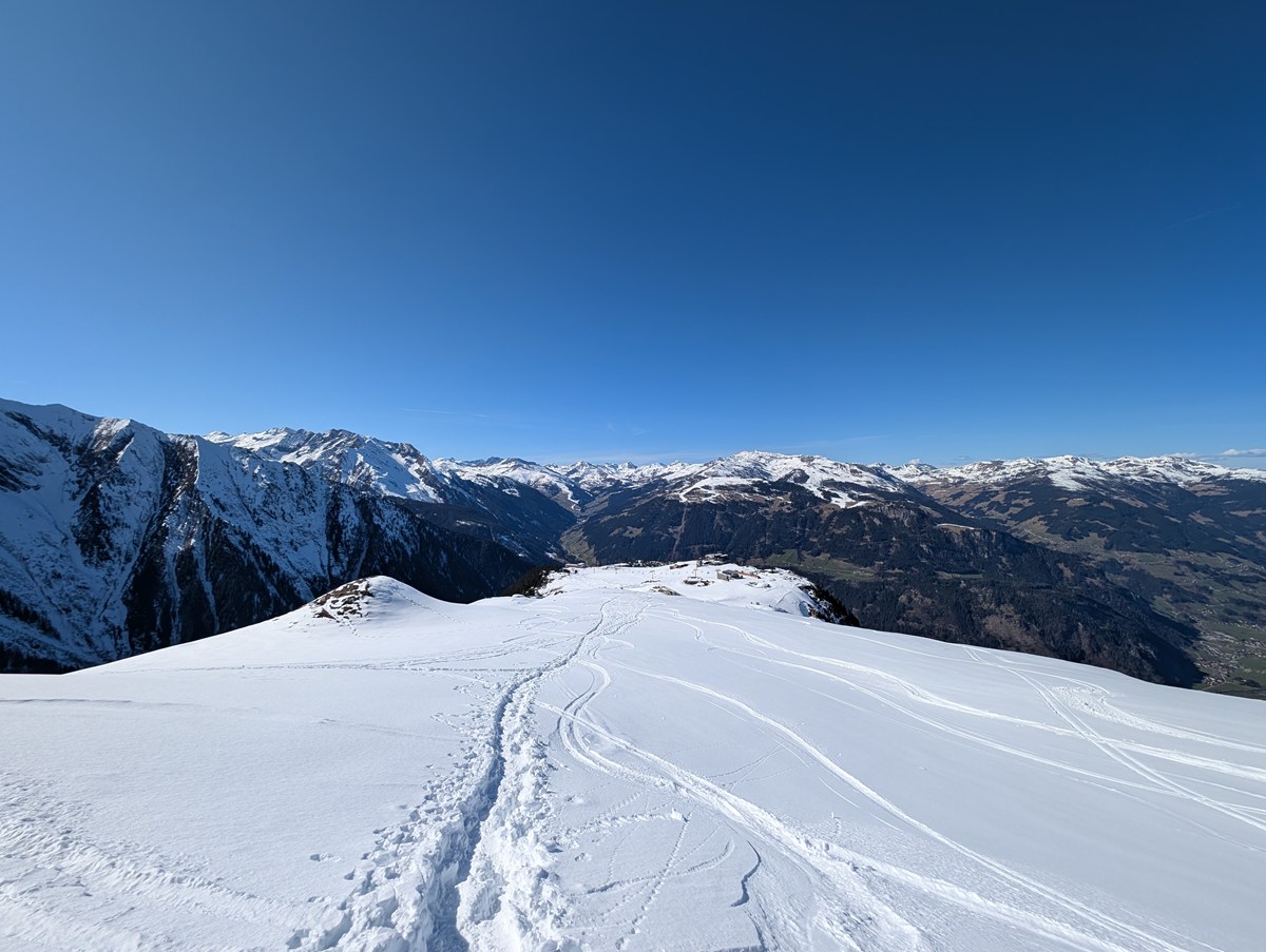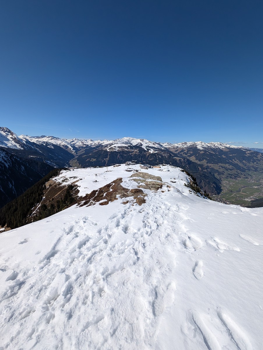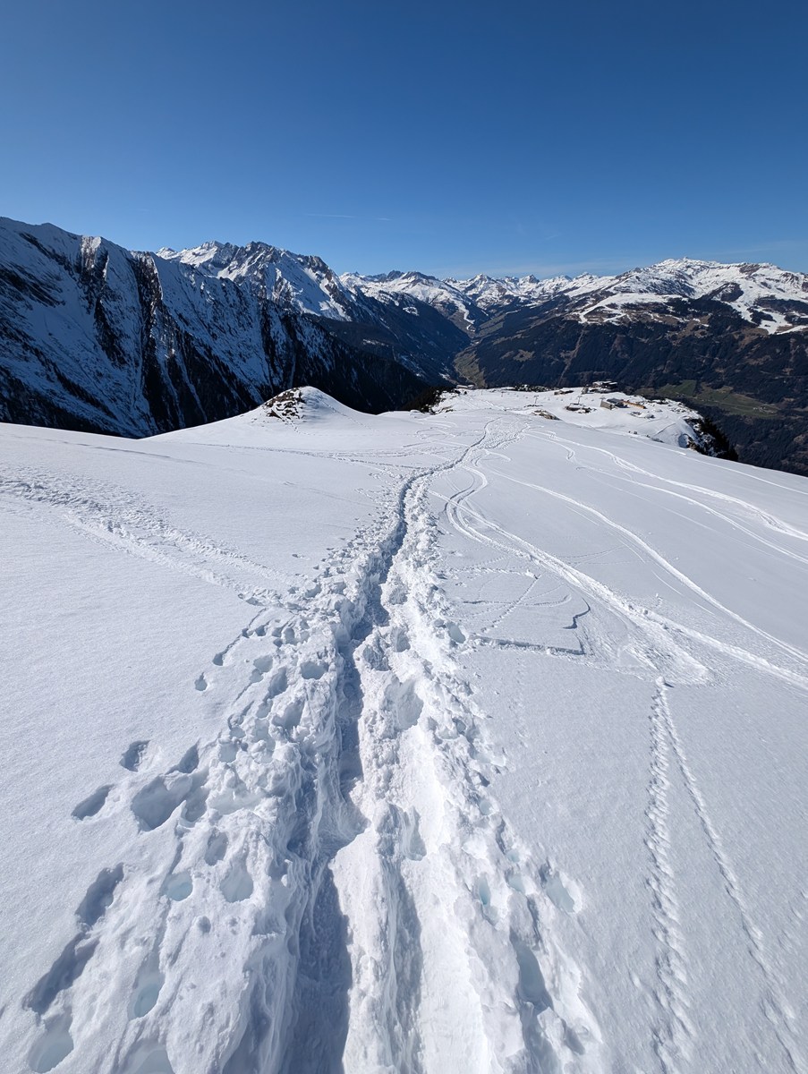 最初は順調。じつはこの朝、バタバタしていてせっかくオーストリアまで持ってきたスノーシューズに履き替える時間がなくハイキングシューズで向かったのですが、少なくとも登りは特に滑る感じではなかったです。