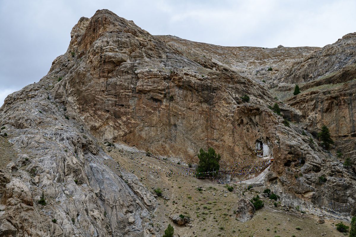 車で来ることのできる地点から、垂直にそそり立つ断崖の狭間を抜け、歩いて約1時間。高低差400メートルほどの登りを経て、尾根の上に辿り着くと、周囲を岩山の斜面に囲まれた、広大なすり鉢状の地形が開けていました。岩の斜面のところどころに、ぽつぽつと黒い洞穴のようなものが空いています。対岸に見える垂直の斜面には、大きな洞穴の入口を埋めるような形で造られている白壁の構造物があり、周囲には5色の祈祷旗(タルチョ)が幾筋も張り巡らされていました。このすり鉢状の地形の一帯が、ポカル・ゾン、またはウルギェン・ゾンと呼ばれている聖地です。
