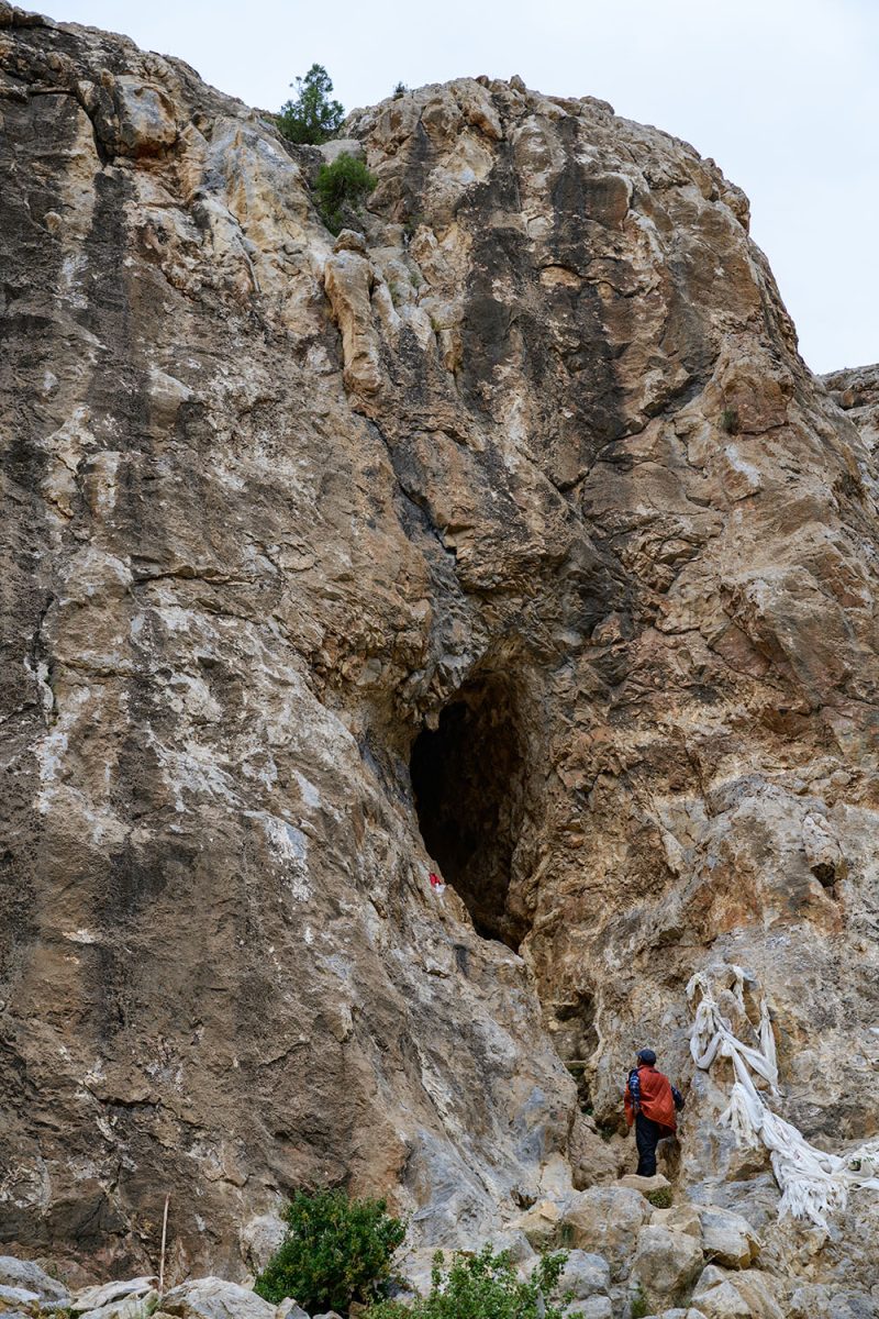 少し離れた場所には、ダクプク・ヨグマと呼ばれる、別の石窟がありました。洞窟の入口に石壁などが継ぎ足され、扉もつけられています。扉を確かめたタシさんが、「中に入れますよ」と案内してくれました。