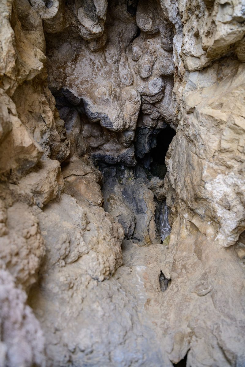 タシさんの後について、さらに歩いていくと、一番大きいと思われる石窟の手前の崖に、いくつもの大きな洞穴がありました。この一帯は地質的にも、こうした洞穴が生じやすい場所だったのかもしれません。