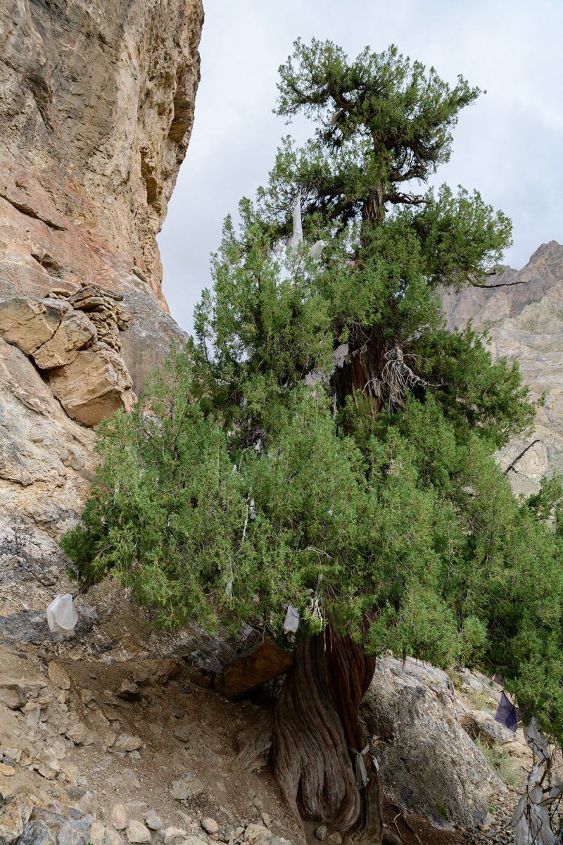 ねじれたような独特の太い幹を持つ、大きな木が生えていました。これはシュクパ(ヒマラヤスギ)というヒノキの一種で、ラダックをはじめとするチベット文化圏では、聖なる樹木とされています。シュクパの葉は香りが強く、サンと呼ぶお香として、香炉に焚べるなどして用いられます。