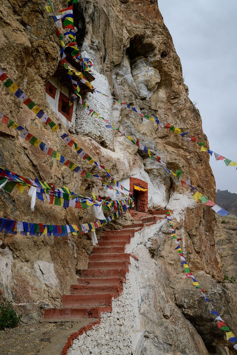 ポカル・ゾンの中心となる、もっとも大きな石窟。2つの洞穴が奥の方でつながっていて、入口には白い石壁が築かれ、小さな戸口や窓が造られています。僕がこれまでにラダックやザンスカールで目にしてきた中でも、自然の地形を利用して造られた祈りの聖地としては、群を抜いて個性的なスタイルの場所だと感じました。