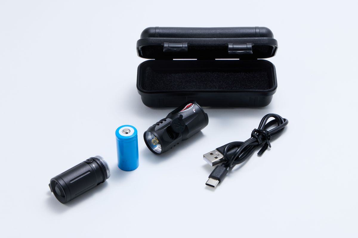 とにかく明るい小型LEDライトをお探しならこれをどうぞ。「Light of Shark(ライト・オブ・シャーク)」は明るさに特化したモデルで、光量の最高は900ルーメン。サメのように獰猛だぞ。