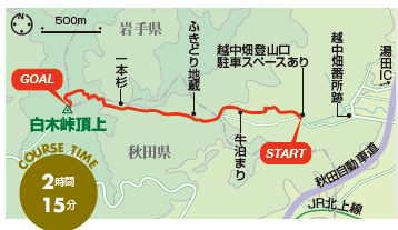 山のスタートは岩手県和賀郡の登山口だ。沢内街道はかつて盛岡から横手へ抜ける交易の道として使われ、江戸期には番所もあったそう。生活のため人々が米や海産物、鍋釜を背負い、冬は雪深い峠を越えて往き来したという。その最高地点が岩手と秋田の県境にある白木峠だ。