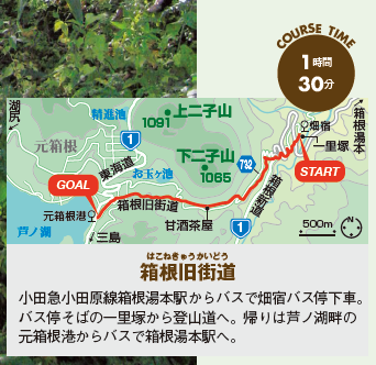 小田急小田原線箱根湯本駅からバスで畑宿バス停下車。バス停そばの一里塚から登山道へ。帰りは芦ノ湖畔の元箱根港からバスで箱根湯本駅へ。