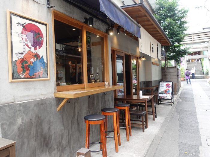 最初の信号を渡ると、すぐ右手に鳥居が見えてきた。烏森神社である。本来なら最短ルートを進むであきところを、東京ハイキングでは面白そうなものを優先して歩く。鳥居をくぐり神社へ向かう参道へ。着物姿の女性の後姿の看板が印象的なコーヒーショップ「烏森珈琲」がある。のぞいてみると、店内もオシャレだ。驚くべきは、夜になると「烏森百薬」という居酒屋に変わるようで、後で調べると居酒屋の評判も良さそうだ。