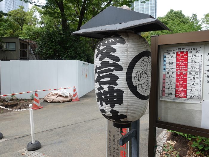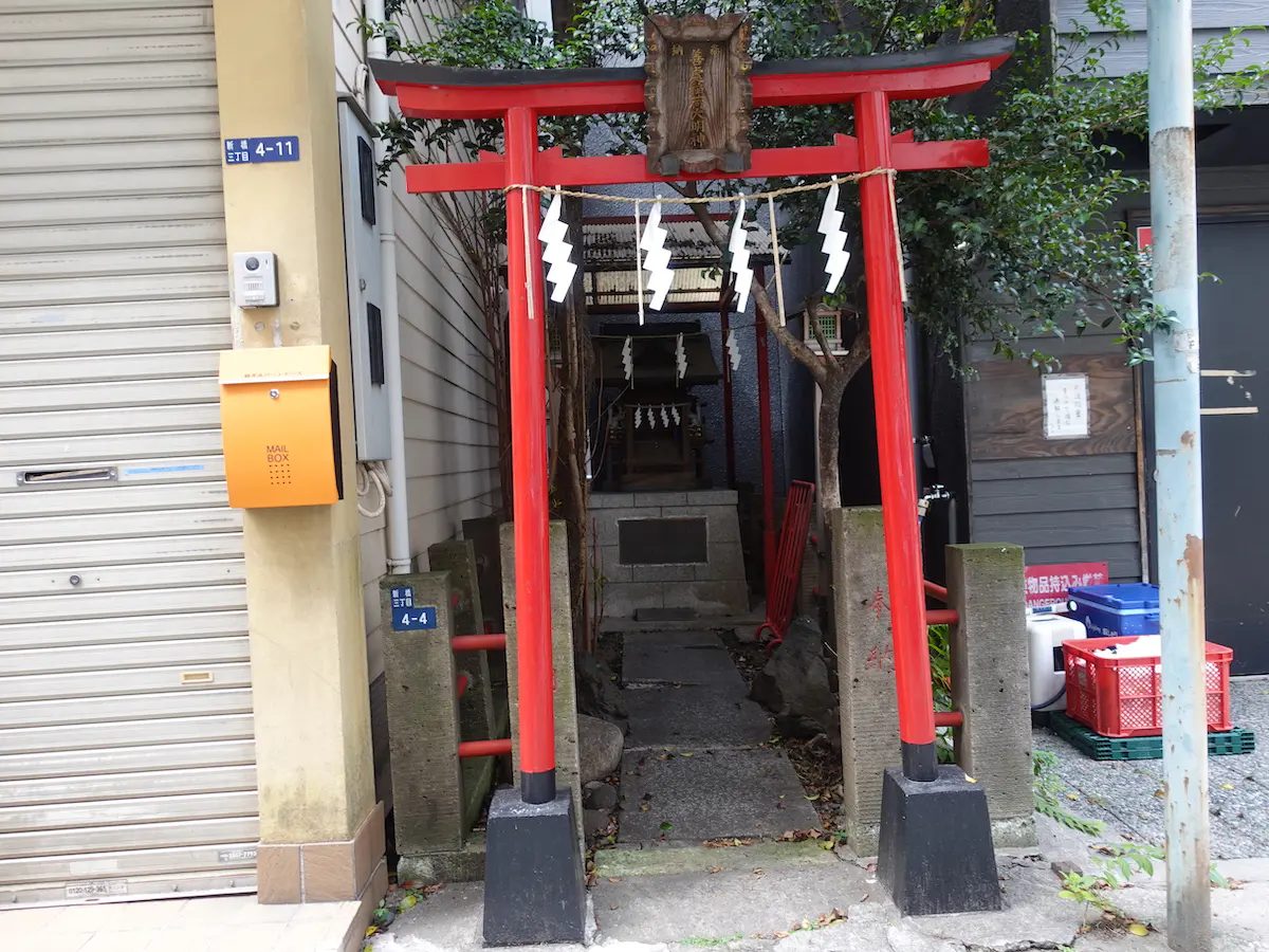 通りに出て、あらためて愛宕山を目指す。 床屋さんの看板を目印に左に曲がると、細い路地になる。まっすぐ進むと右手に「居酒屋コン」が見え、そのまま右に曲がると小さなスペースにひっそりとたたずむ「善処稲荷大明神」があった。いかにも都会の神社だなと思いつつ、 軽く手を合わせてさらに先に進む。