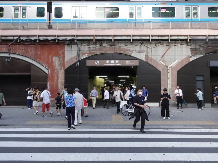 さっそく、JR新橋駅烏森口登山口をスタート。さすが新橋、ビジネスパーソンをはじめ多くの人々でごったがえしている。まずは、烏森口を出てまっすぐ道なりに進む。