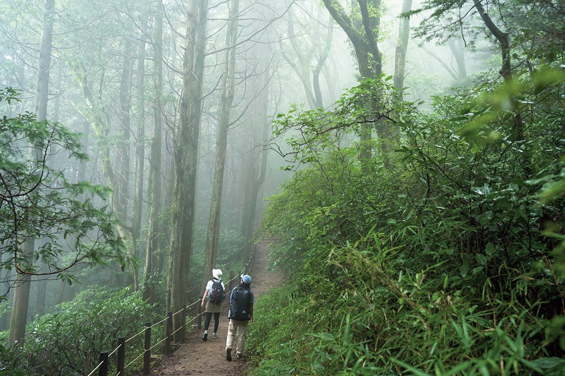 高度を上げるうちに雲のなかへ入った。標高600mより上から森が深くなる。スギやアカガシが茂り、深山幽谷といった趣に。