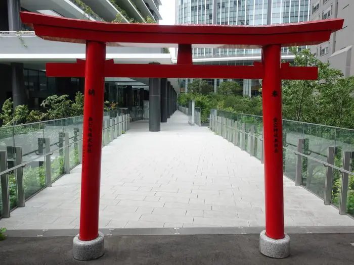 鳥居をくぐると、車道が山頂に向かって続いていた。ここからはちょっとした急登だ。少し登ると、真新しい鳥居が右手に見えてきた。森ビルの名前が入っていた。鳥居の先には、虎ノ門ヒルズレジデンスタワーへ続く道が建物の脇にあった。 名付けて「虎ノ門ヒルズルート」。ここなら、虎ノ門ヒルズ駅登山口でおりてビル内を通れるので、悪天候の時のルートとしていいかもしれない。