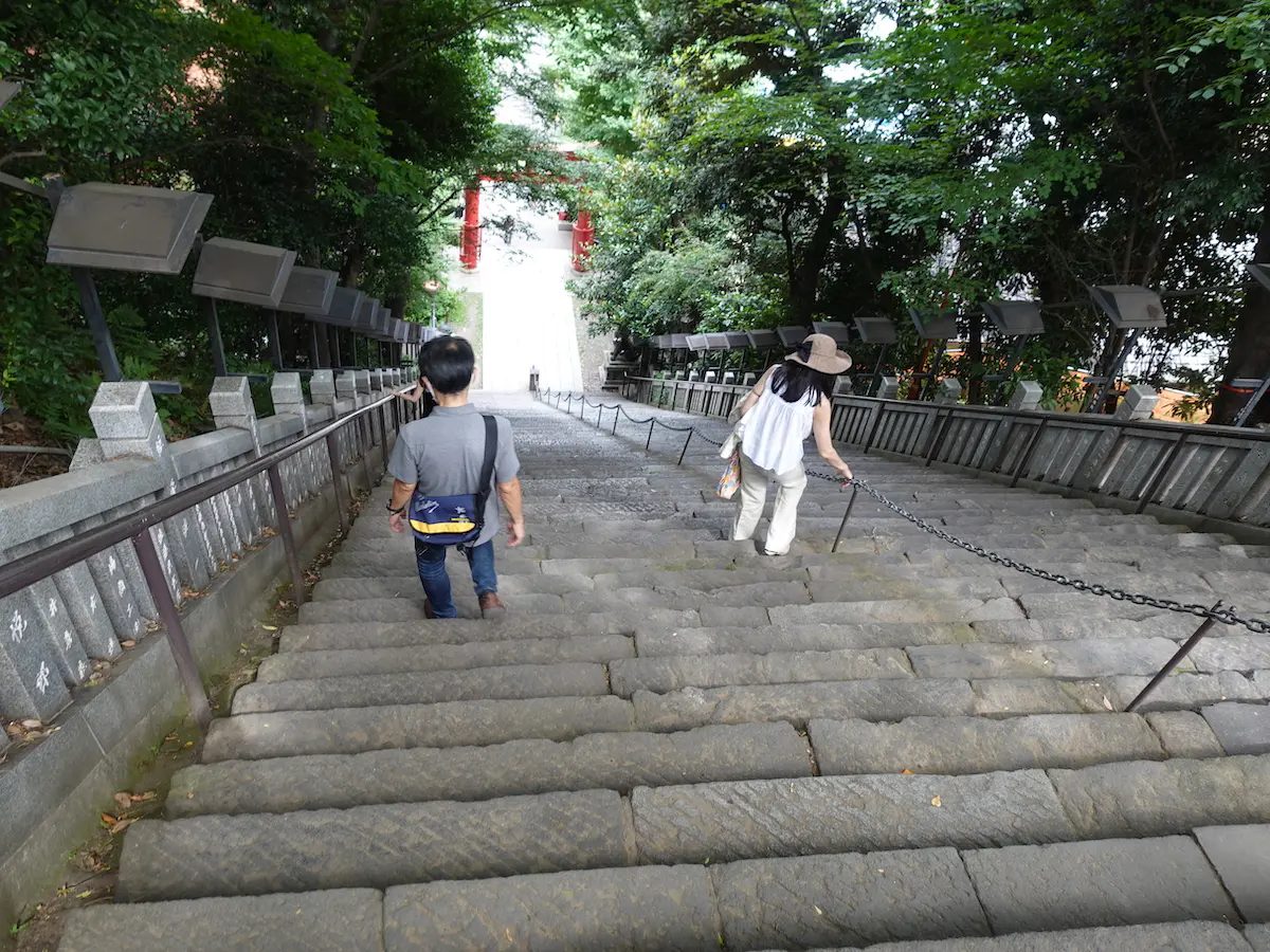先ほどの車道ルートを登らずにそのまま道を進んでいくと、右手に愛宕神社へ続く参道と大きな鳥居が見えてくる。鳥居をくぐると、聳え立つ壁のような男坂の石段。多くの人は見上げて、何かをつぶやき、覚悟を決めてこの男坂を登っていく。そして、 ほとんどの人が階段を上り始めて少しのところで再び上を眺め、ため息をついていた。86段の道のりが遠い。