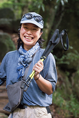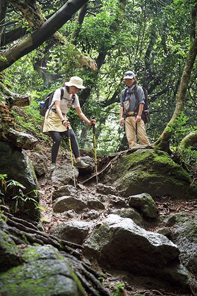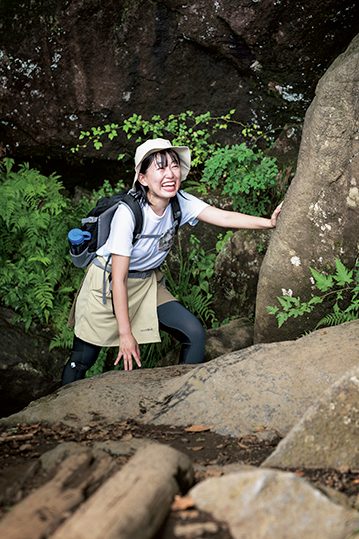 梶:へえ〜! いま私たち雲のなかなんですね。日差しが遮られて涼しいけど、霧で濡れた岩が滑ってちょっと怖いかも……。
