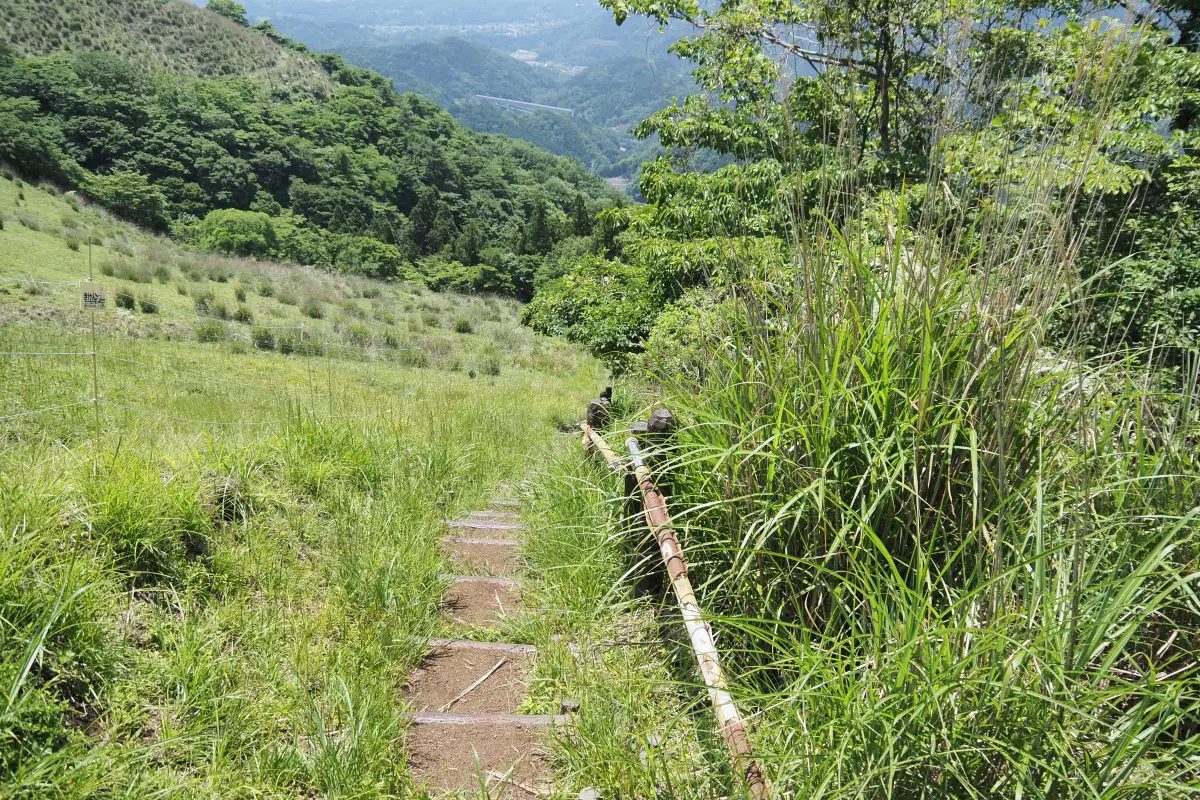低くたなびく尾根は、まるで龍の背のごとし。小さなアップダウンが続き九連峰と呼ばれる。日本一のハイキングコースとして整備され、地元の人々に愛されている。低いながらも眼下の町と田んぼの眺めはスペクタクル。
