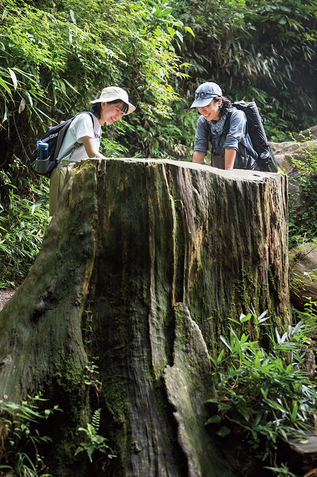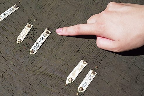 10年ほど前の台風で倒れたスギの切り株。年輪には赤穂浪士の討ち入りや天明の飢饉、明治元年などその年の出来事が記されている。
