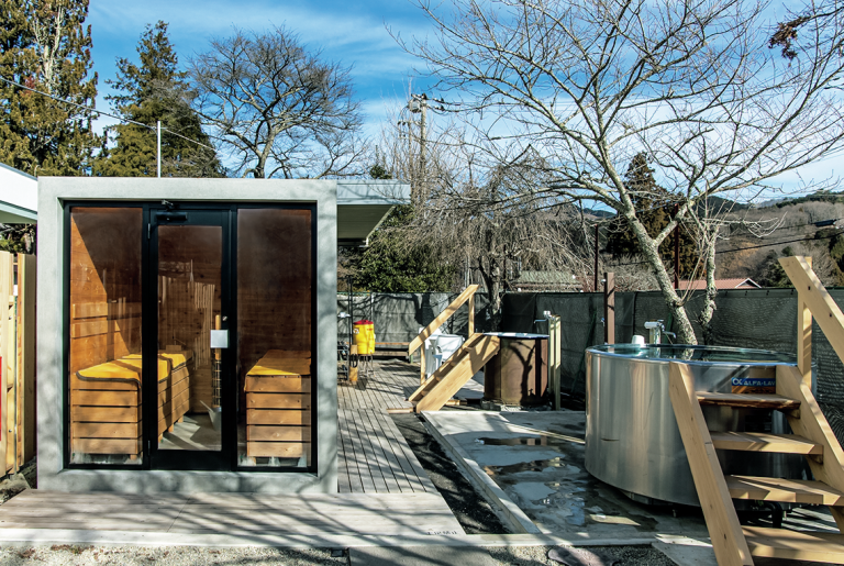 キャンパー専用のバレルサウナ。温まったら清流白沢川で冷水浴。2~4名で利用できる。1人3,000円~。