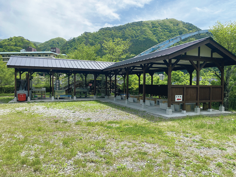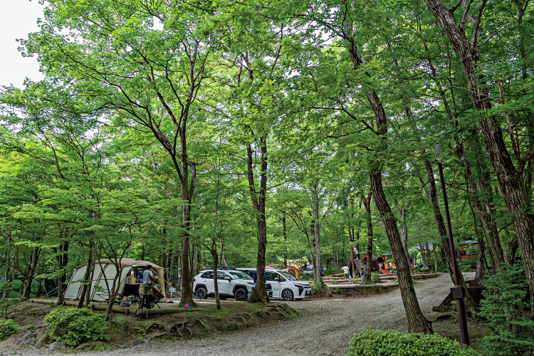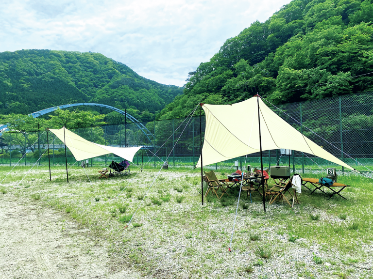 全サイト、犬連れOKなので愛犬といっしょに過ごすのもいい。ただし、ほとんど木陰がないので、暑い時季にはタープは必須だ。設備はトイレと洗い場とシンプルだが、温泉もあるし、管理も行き届いている。最寄りの野岩鉄道会津鬼怒川線・川治湯元駅から徒歩約10分。敷地内には鉄橋が通っていて、ゆっくりと走る列車を見物できる。