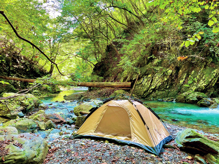 登山前日は軽量チェアでのんびりくつろぎ、登山後は川から流れるBGMに癒やされる。とても贅沢な時間を過ごせる。