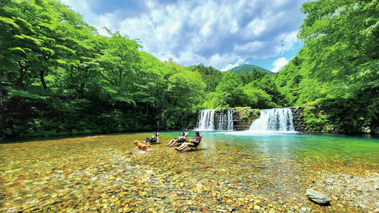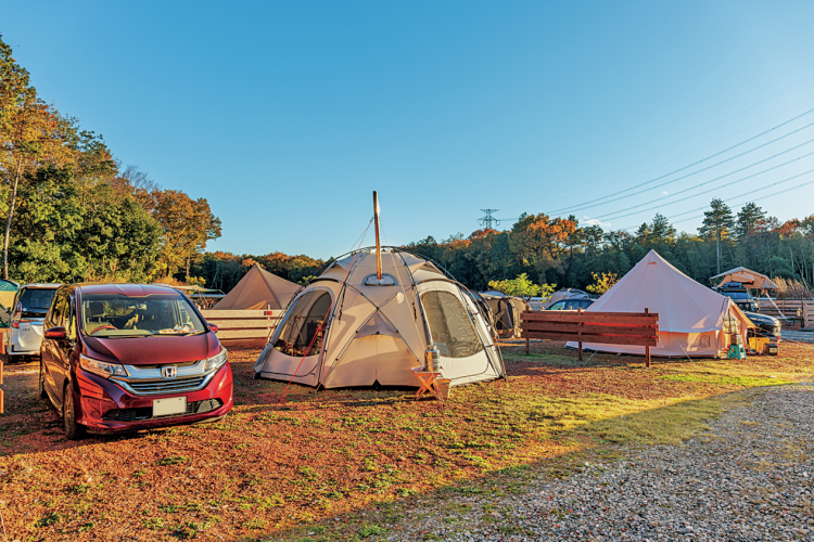2022年にオープンしたキャンプとグランピングを体験できる複合施設。オートサイトは28サイトあるが、全サイトが小川や自然の清流の近くにレイアウトされていて、2ルームテントを張っても余裕の広さが確保されている。