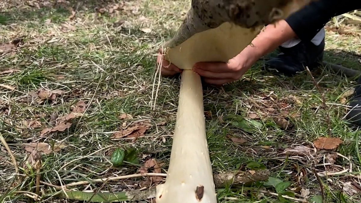 樹皮であれば、木が地面から水分をたっぷり吸い上げる春から初夏にかけて採取するのが一番いい。鋭い黒曜石で樹皮にまっすぐ切り込みを入れ、幹から剥がすと、スルスルスルっと簡単に取れる。これはもう病みつきになる気持ちよさだ。