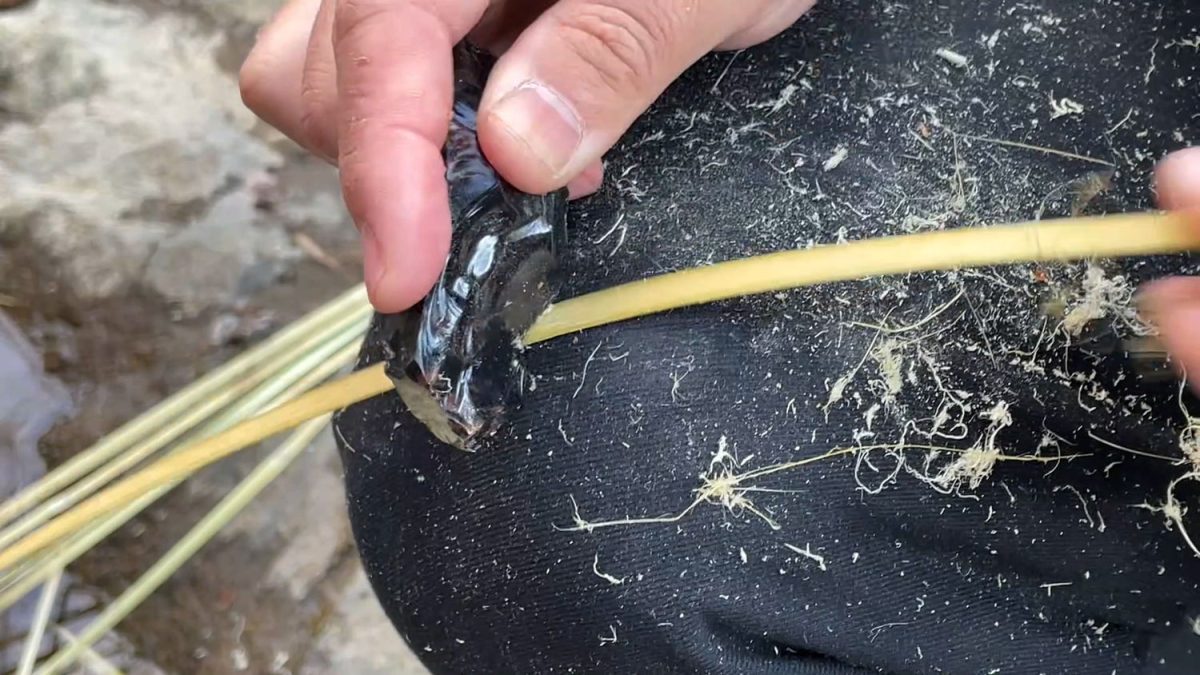 試行錯誤の末、笹を割る専用の石刃(せきじん)を1日がかりで作り出し、この問題を乗り越えることができたのだが、結局、カゴひとつ作るのに88時間もかかってしまった。