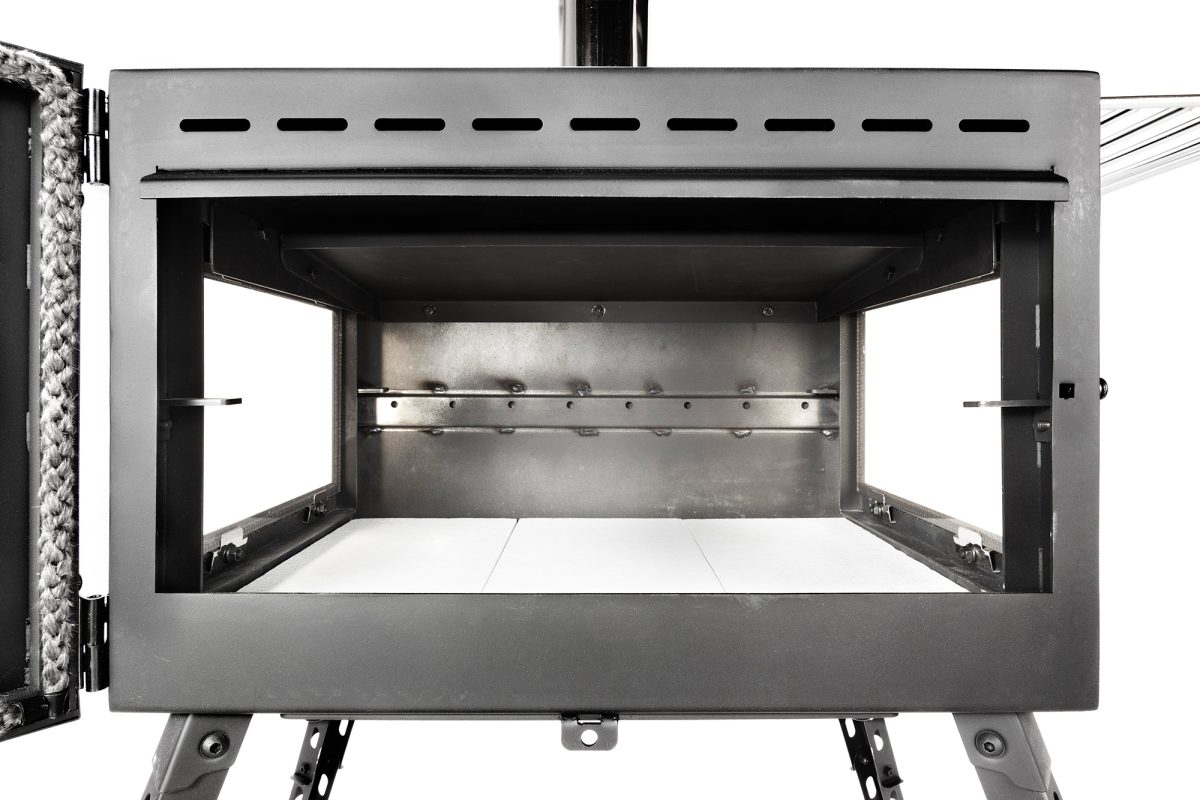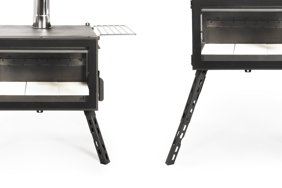 「オーラ」は炎を楽しめるフルガラス構成が持ち味の薪ストーブ。暖房と調理を両立する実用設計で、設置や手入れがしやすい。冬のキャンプを想定した堅牢さと使い勝手を押さえたラインだ。