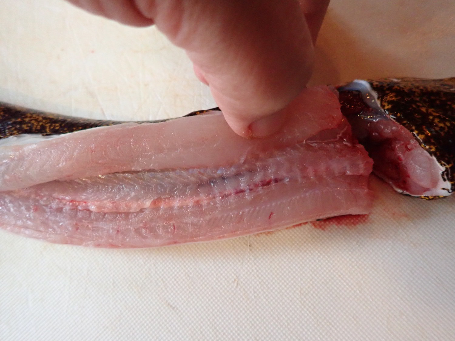 ② 刃先を真っ直ぐ背びれの骨に沿わせながら入れていきます