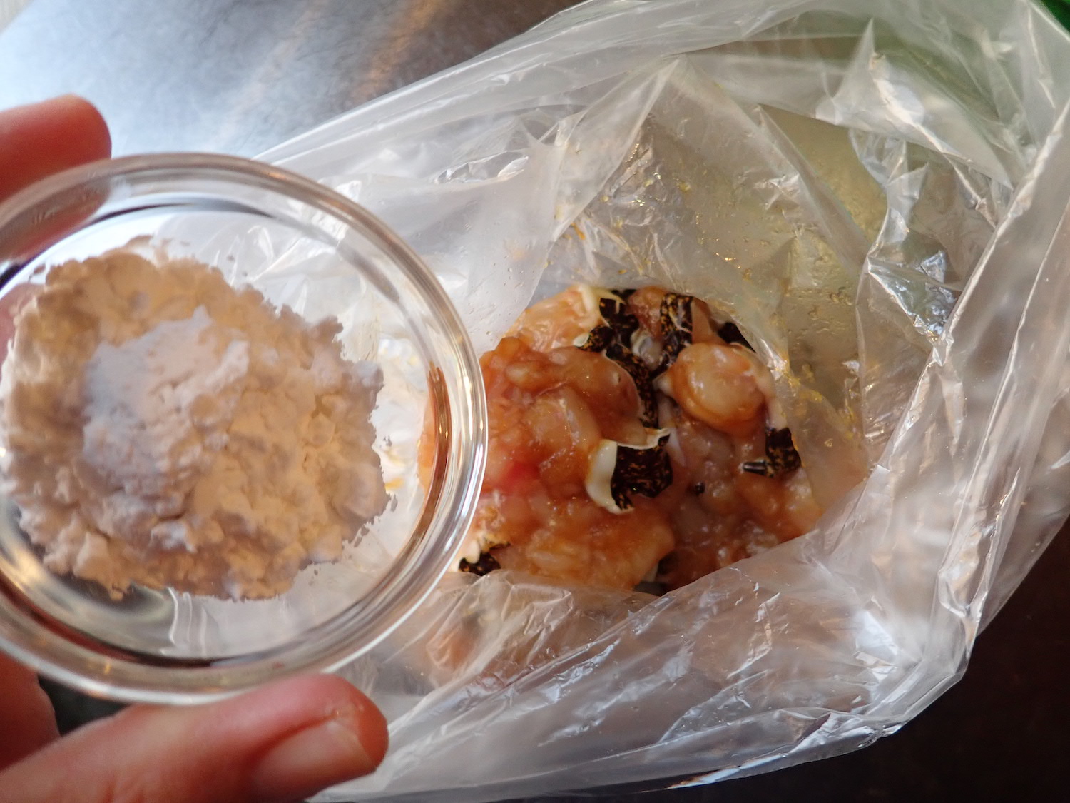 2:ビニール袋にニンニク、醤油を入れよく揉みこみ15分~30分ほど漬け込みます。