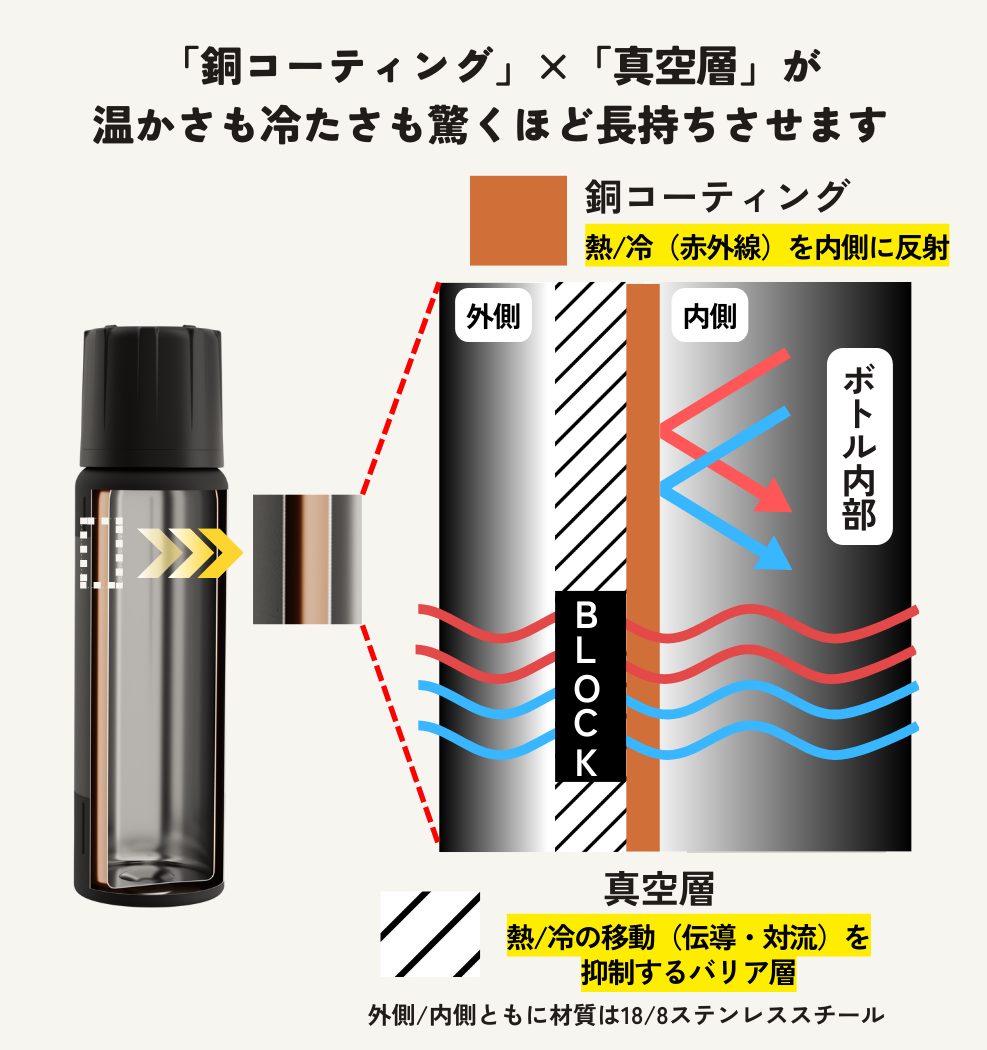 内側の銅コーティングが赤外線(熱放射)を反射し、内部温度の変化を防ぐ。