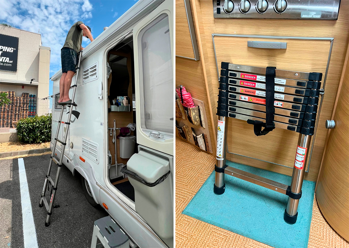 屋根の点検やソーラーパネルの掃除、コーキングのメンテナンスなど、想像以上に“上の方”の作業が多いキャンピングカー。しかし、高さが2m70cmもあるので、作業がなかなか大変。そこで助かるのが、折りたたみ式のハシゴです。小さくたためるので、狭い車内にも収納でき、旅先でも急な屋根の修理に対応できとても助かっています。旅の初めは「いらないかな」と思っていましたが、後からその必要性を実感して追加した、大正解アイテムです。