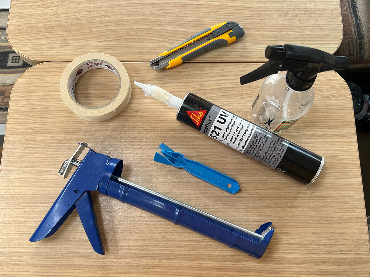 コーキング剤は、すき間やひび割れを埋めて、防水・気密・防塵などの効果を持たせるためのペースト状の材料です。キャンピングカーでは、シャワールームやシンクの水まわり、屋根の接合部、外壁パネルのつなぎ目、窓枠、ソーラーパネルまわりなど、さまざまな場所で使われています。しかし、劣化しやすいので、定期的な打ち替えが必要になります。旅先でもちょっとした補修ができるように、常備していると安心です。