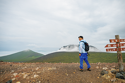 「イワオヌプリ」はアイヌ語で硫黄山。その名のとおり、硫黄の匂いが漂う。山頂付近はガレ場が続き、濃霧が発生しやすい。天気が良ければ、羊蹄山、昆布岳などが見渡せる。