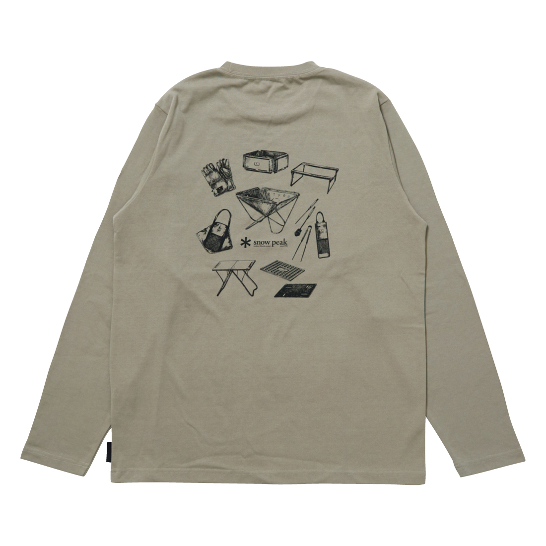 スノーピークを代表する焚火ギアを、手書き風タッチで描いたプリントロンT。