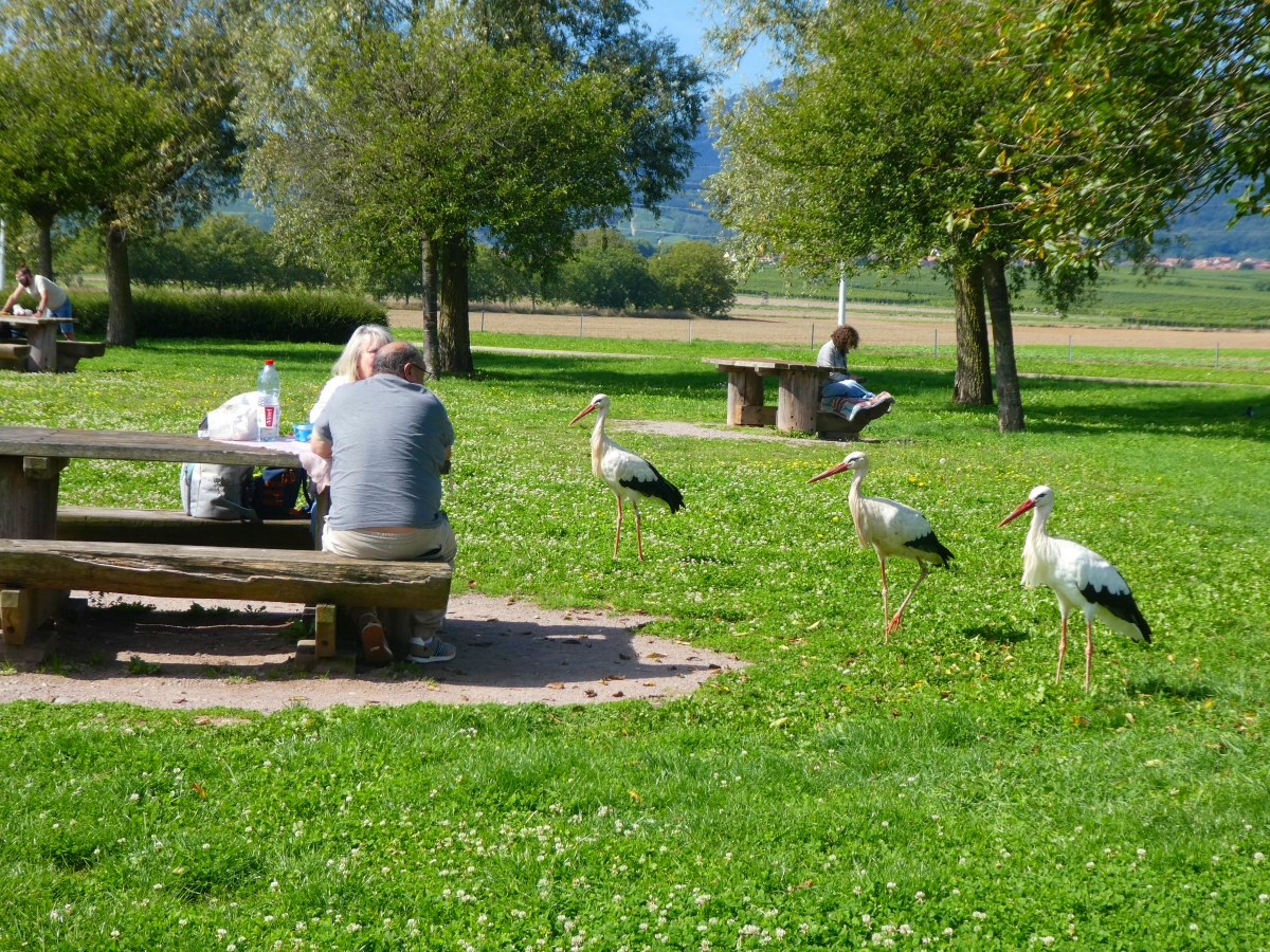 おこぼれを期待して、辛抱強く静かに待つヨーロッパコウノトリたち。
