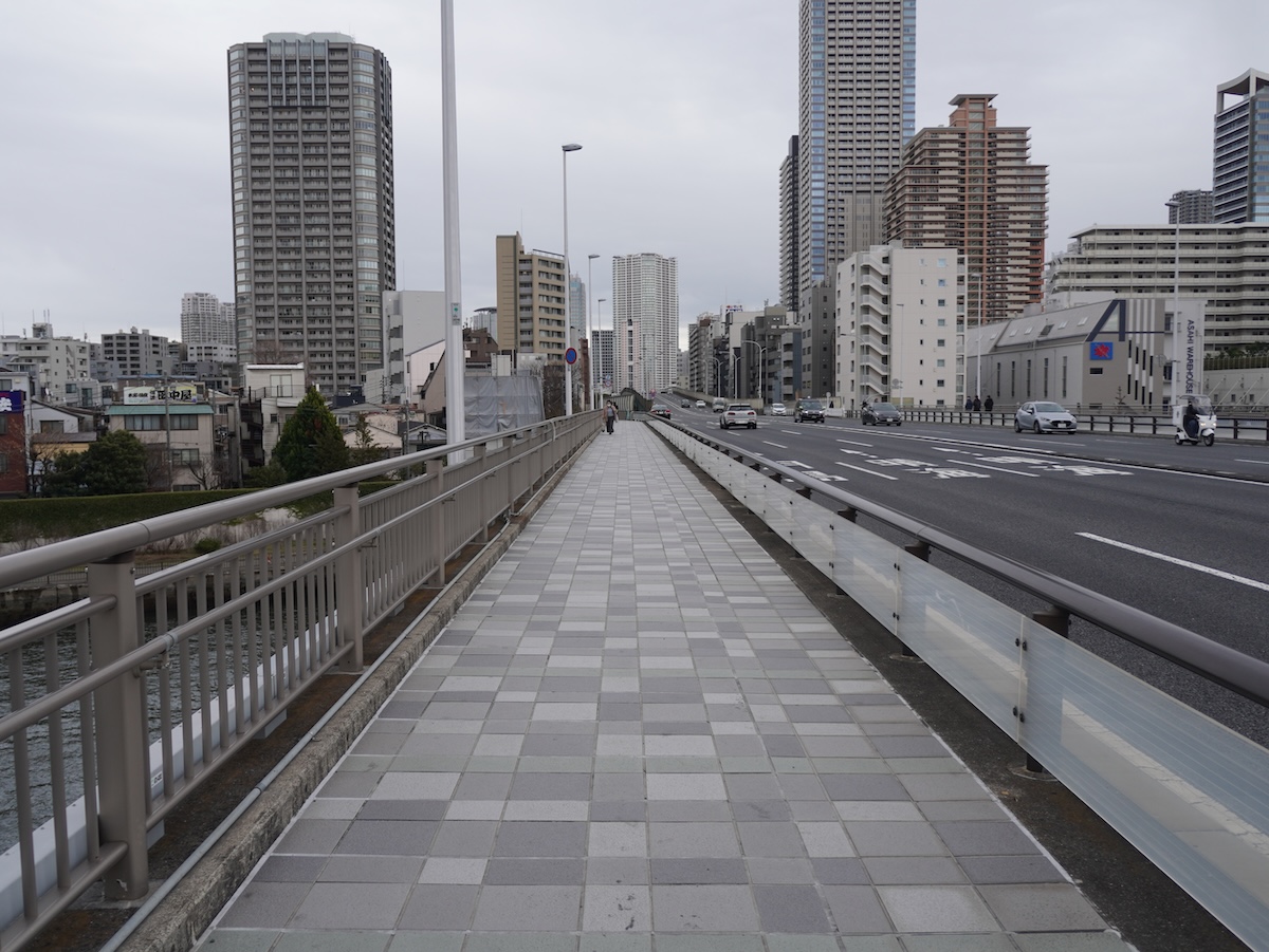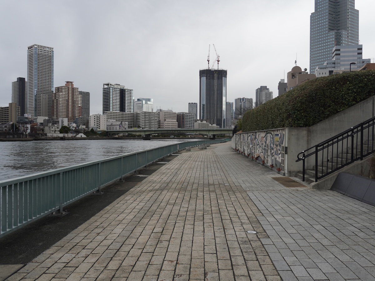 川越しに対岸の佃島エリアは見通せるものの、この日はあいにくの曇り空で、遊歩道は何とも殺風景です。でも、これはこれで都会のGREEN WAYの渋い一面ではないか、などと思いながら歩を進めるのでした。