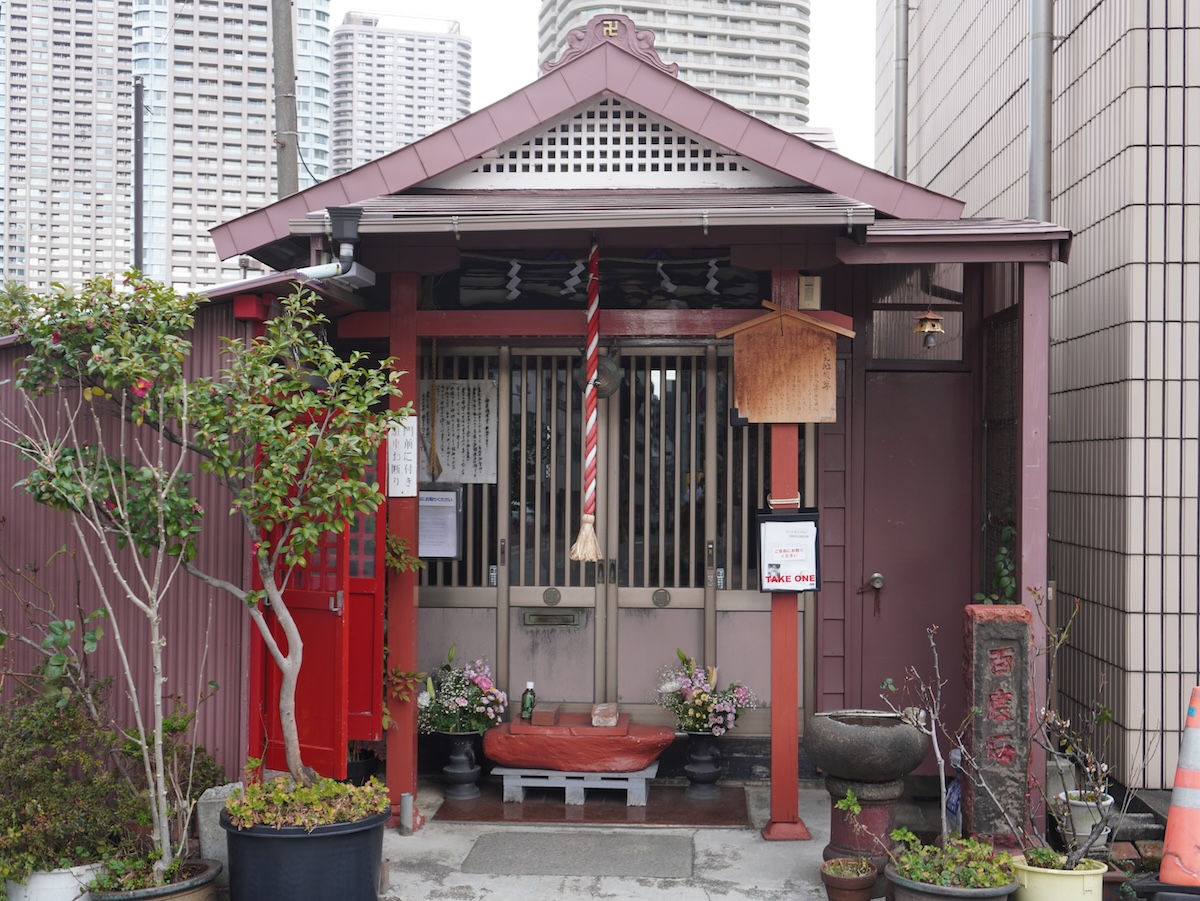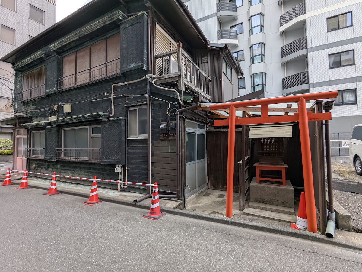 銅板やモルタルを貼った建物は「看板建築」と呼ばれ、関東大震災後に建てられた住居兼用の木造商店建築を指すそうです。中央区や千代田区を歩いていると、看板建築をたまに見かけます。南高橋の近くの看板建築は、とても手入れが行き届いています。敷地内には鳥居もあって良い雰囲気ですし、何とも心惹かれる佇まいです。