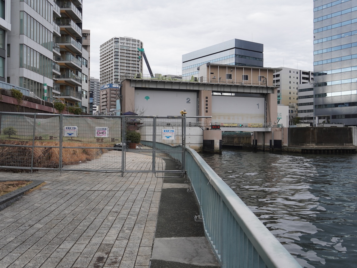 その看板建築を回り込むようにして脇道を進むと、ようやく亀島川沿いの遊歩道に入れました。残念ながら亀島川水門は工事中の様子でしたが、遊歩道は先まで伸びています。